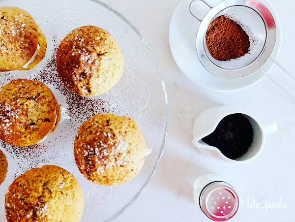 Lo primero que vamos a hacer es elegir dónde los queremos presentar, a mí personalmente me gusta servirlos en una base de tarta. Los colocamos y espolvoreamos un poco de cacao y azúcar glacé por encima.