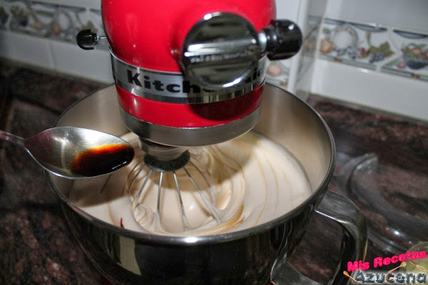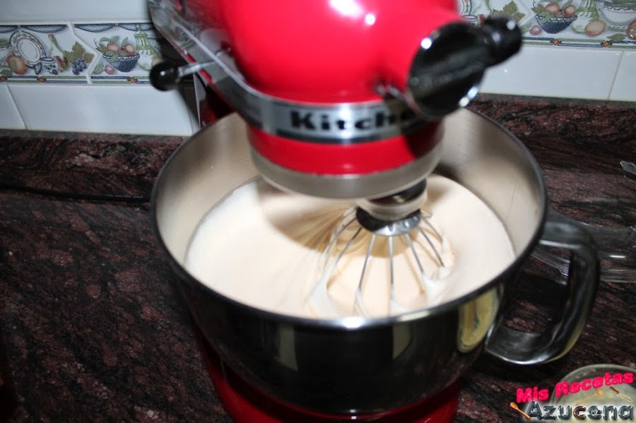 Le añadiremos el sobre de estabilizante y empezaremos a batir la nata (crema de leche) hasta espese lo suficiente como para hacerle un surco con el dedo y este no se cierre, entonces ya la tendremos lista, reservamos en la nevera hasta su uso.