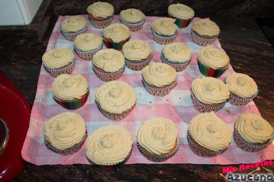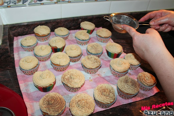 Cuando tengamos todos listos cogeremos y mezclaremos un poco de café soluble con cacao en polvo y con ayuda de un colador espolvorearemos por encima de todos los cupcakes.