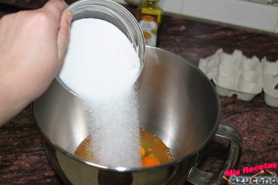 Ponemos en una amasadora o en un bol los huevos y el azúcar, los huevos también tendremos que tenerlos a temperatura ambiente, batiremos hasta que lo huevos queden espumosos.