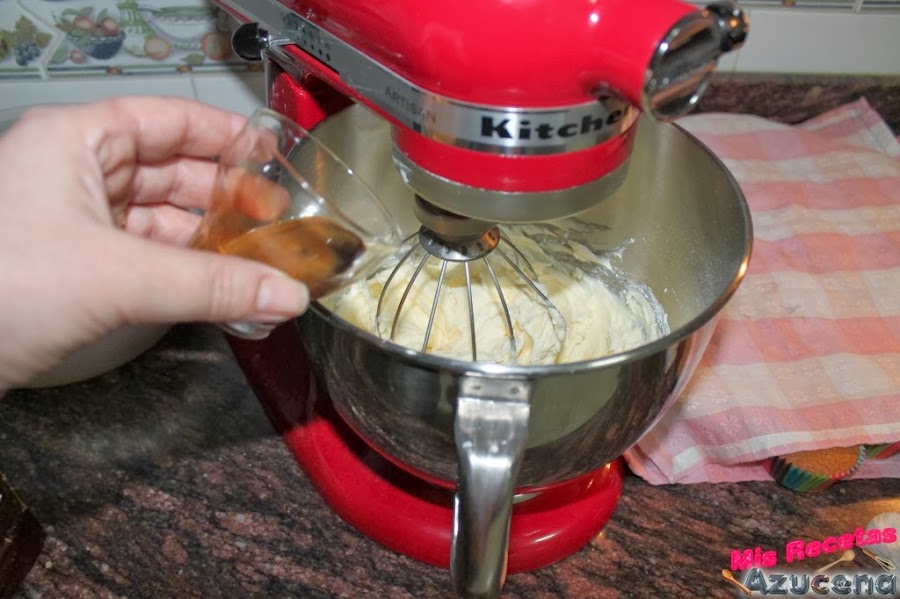 Seguidamente añadiremos las cucharadas de extracto de vainilla, una pizca de sal y la mantequilla, seguimos batiendo.