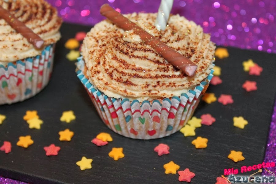Para terminar le pondremos un poco de purpurina comestible y unos trozitos de barritas de cada sabor, antes de poner la buttercream si no van a comer niños, podéis añadir un poco de café fuerte con licor de amaretto, le va muy bien.