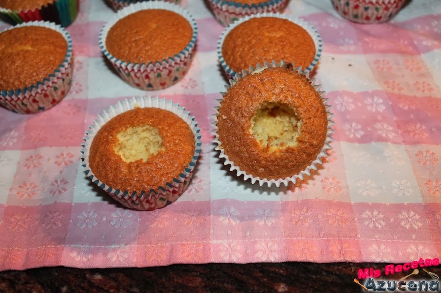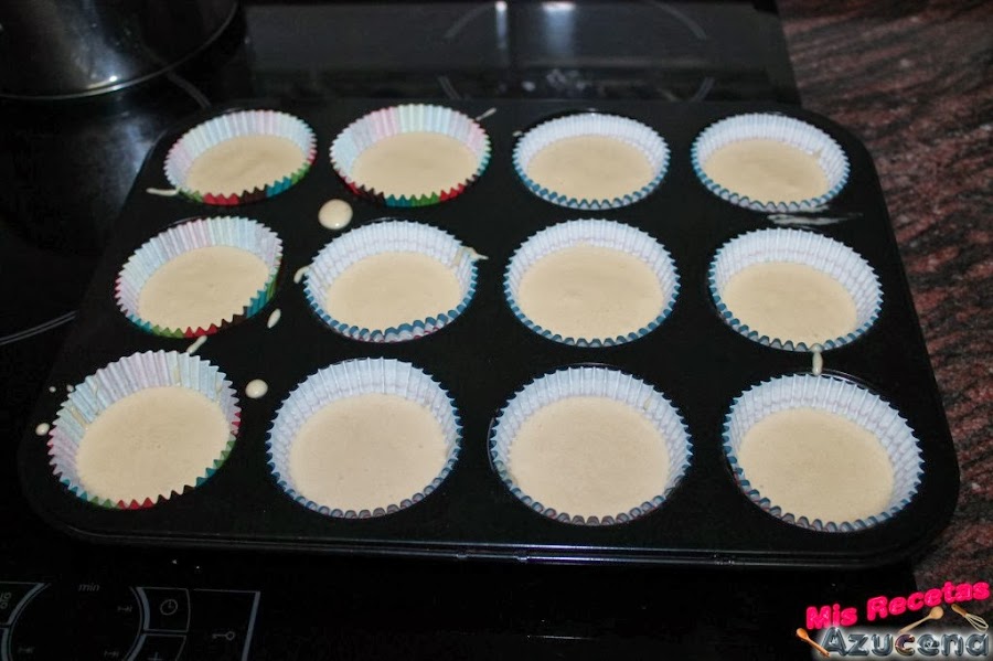 Una vez lista toda las masa con ayuda de un sacador de bolas de helado o con una cuchara iremos rellenando las capsulas poco más de la mitad, unas ¾ partes de la capsula.