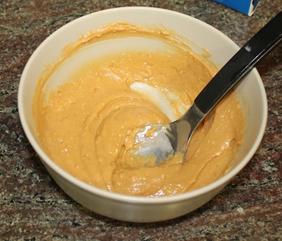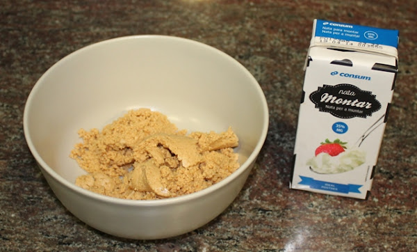 Mientras tanto preparamos el relleno, para ello, con un tenedor o con una picadora, chafamos el turrón y lo mezclamos con la nata (crema de leche) hasta conseguir una crema.