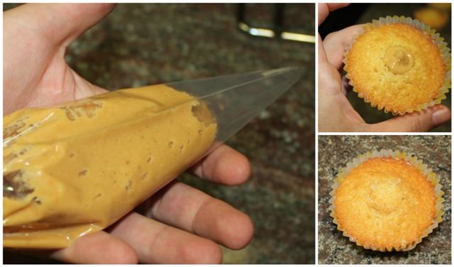Cuando los cupcakes estén fríos los vaciamos en el centro, con la ayuda de un descorazonador de manzanas, y los rellenamos con la crema anterior. Un consejo, si lo ponéis en una manga pastelera os será mucho más sencillo el proceso.