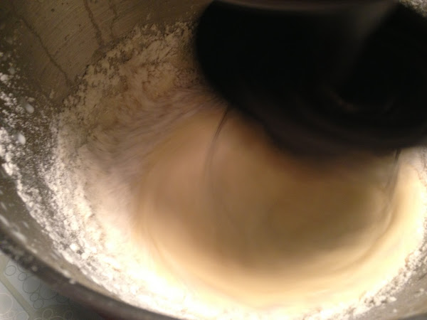 Seguimos con la batidora en marcha y vamos agregando la leche, la esencia de vainilla y por último mezclamos la harina con la levadura y vamos echándola a cucharadas. Dejamos batir hasta que esté todo integrado y lista la masa.