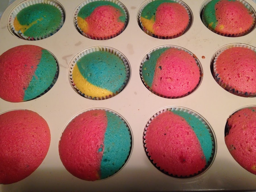 Rellenamos las cápsulas de papel alternando los colores hasta no más de 3/4 partes de su capacidad y horneamos unos 20-25 minutos o hasta que al pinchar con un palillo éste salga limpio.