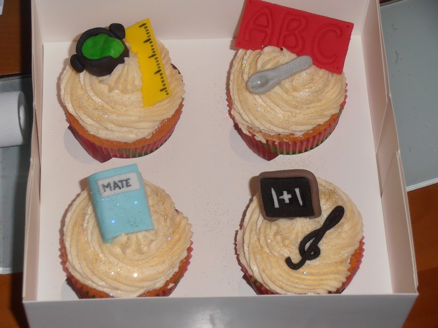 Aquì os dejo otro encargo que me hizo una amiga el viernes pasado, eran unos cupcakes de vainilla con decoraciòn de fondant con motivo de profesoras. Eran para las profesoras de comedor de Alex y su madre, Bego, pensò que les gustarían unos cupcakes como estos. Así que dicho y hecho y así es como quedaron al final, una receta que encontré que quedaron super esponjosos y con mucho sabor a vainilla. Os dejo la foto y la receta para que los podaís hacer y probarlos.