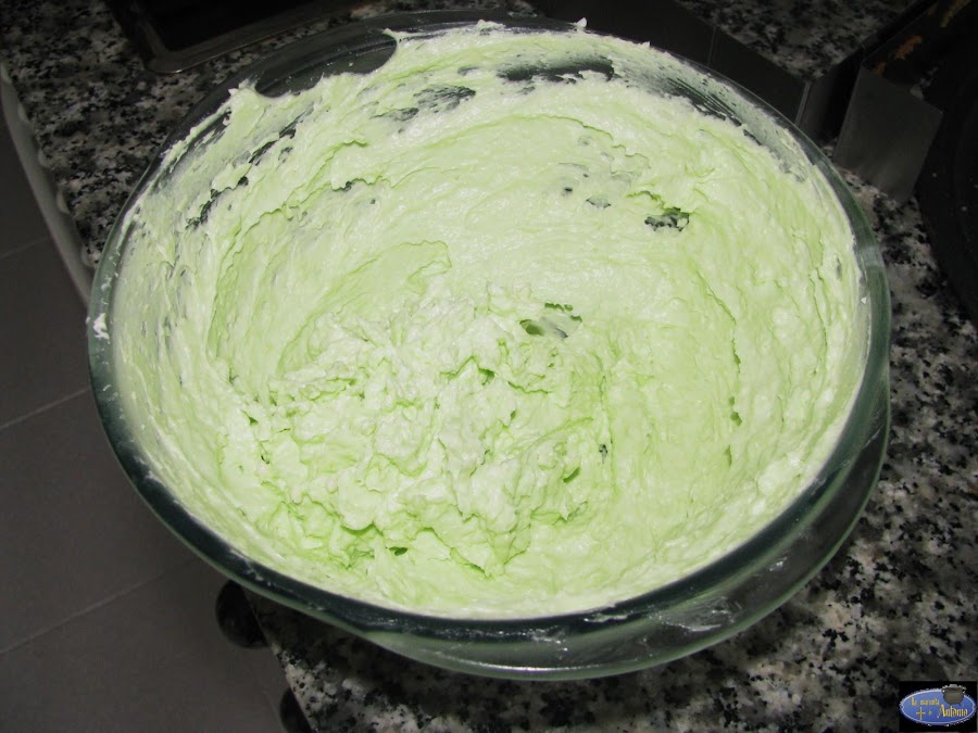 Ahora preparamos la buttercream.Batimos la mantequilla a temperatura ambiente con el azúcar glass y las cucharadas de leche durante unos 4 minutos y le añadimos el puré de manzana.Seguimos batiendo y le echamos el colorante verde al gusto.Normalmente este proceso hay mucha gente que lo hace con máquina pero como de momento no dispongo de tal aparato, pos a mano como toda la vida.