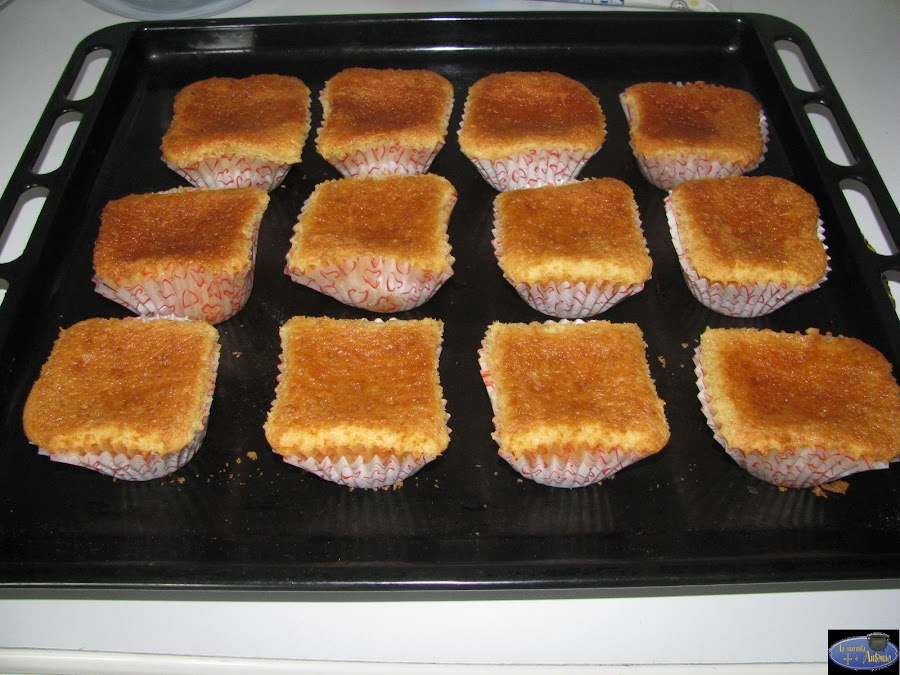 Nada más sacar los cupcakes del horno los pinchamos repetidamente con un palillo y los pintamos con el almíbar de vainilla que tenemos preparado.Dejamos enfriar.