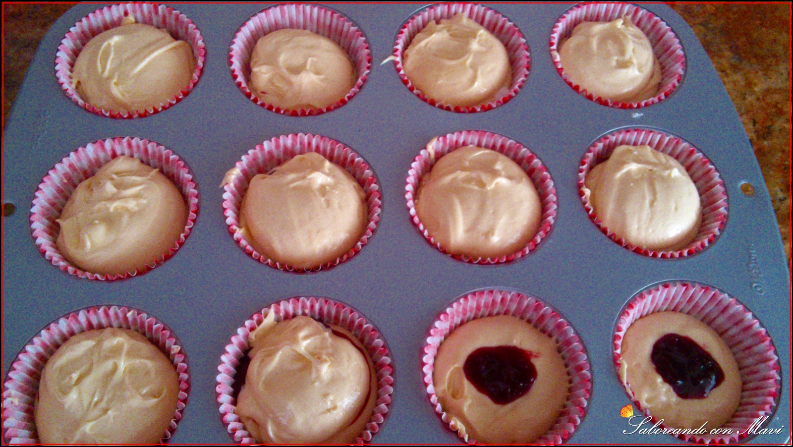 Repartir la masa en los moldes de papel y llenar solo el fondo. Repartir en el centro una cucharadita de mermelada y acabar de llenar hasta 3/4 del molde.