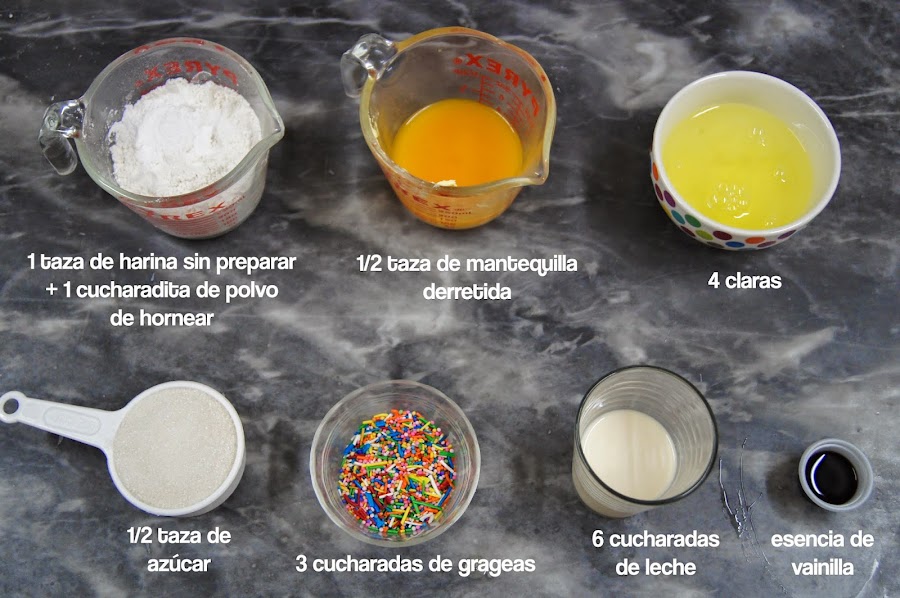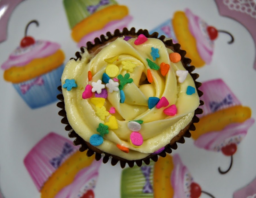 Hace unos días me di cuenta que hasta ahora no había subido ninguna receta de cupcakes. Esta receta la encontre en este blog y la elegí porque se podía hacer con batidor de mano. Yo le agregué las grajeas a la masa ya que los estaba haciendo para un cumpleaños, pero no son necesarias. Para la crema de mantequilla, no tenía azúcar en polvo así que utilice esta receta, que encontré en un libro, a base de un almíbar, es más trabajoso, pero en mi opinión queda mejor y no es tan dulce.