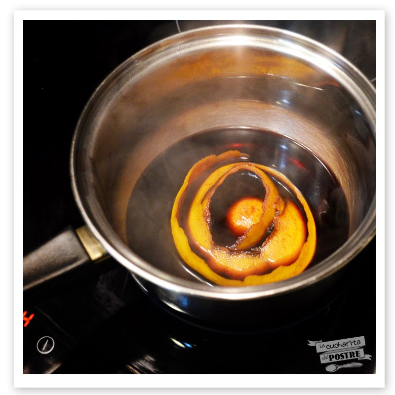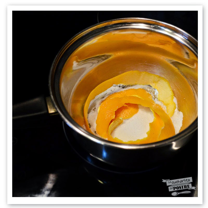1. Pon en un cazo el azúcar con la ralladura de naranja bien limpia.