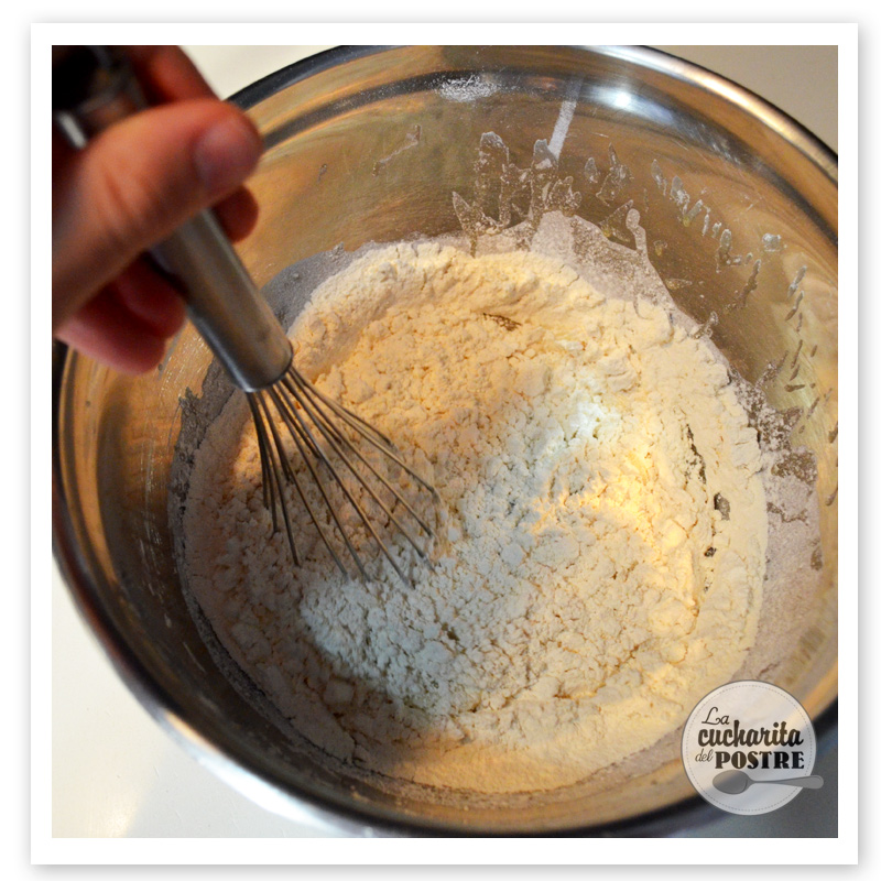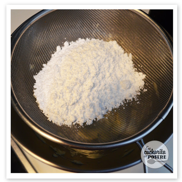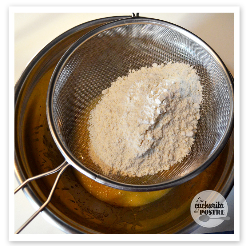 4. Tamiza sobre la mezcla la harina, la pizca de sal y la levadura química o polvo de hornear.