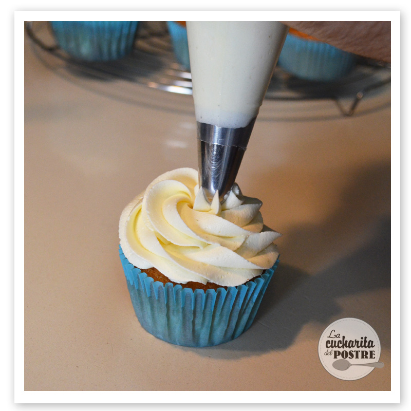 2. Pon la crema en una manga pastelera con una boquilla que te guste (yo he puesto la 2D de Wilton) y decora haciendo "cucuruchos" encima del cupcake. Debes empezar de fuera hacia adentro y hacia arriba en el sentido de las agujas del reloj.