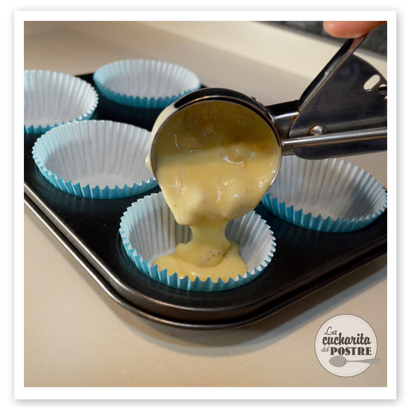 9. Pon el horno a precalentar a 180ºC y, mientras toma temperatura, reparte la masa en las cápsulas para cupcakes llenándolas solo hasta la mitad o 2/3 de su capacidad.
