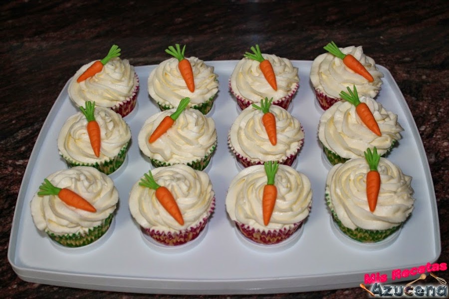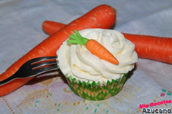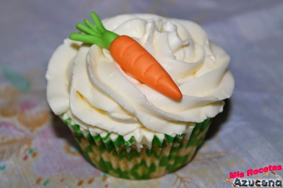 Bueno por lo que os estoy contando ya habéis deducido de que va la receta de hoy, pues si, cupcakes de zanahoria, son fáciles de hacer y quedan muy vistosos, me gustan mucho trabajar con el fondant y hacer figuritas, no es que sea una artista, pero me quedaron muy kukis las mini zanahorias, jeje.