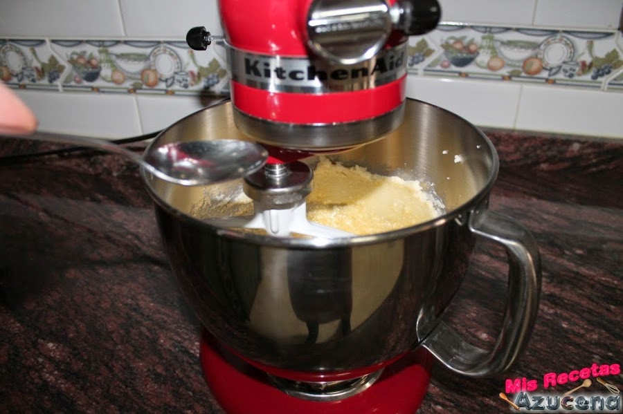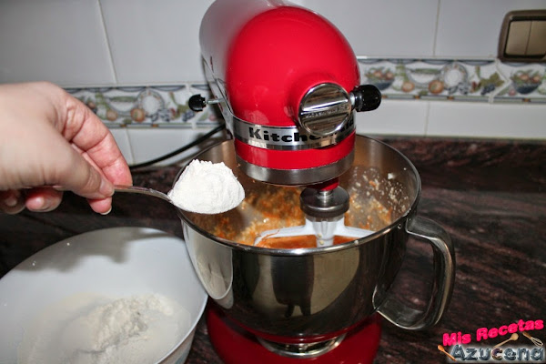 Ahora toca añadir la harina que la pondremos poco a poco hasta gastarla toda, volvemos a mezclar durante unos minutos.