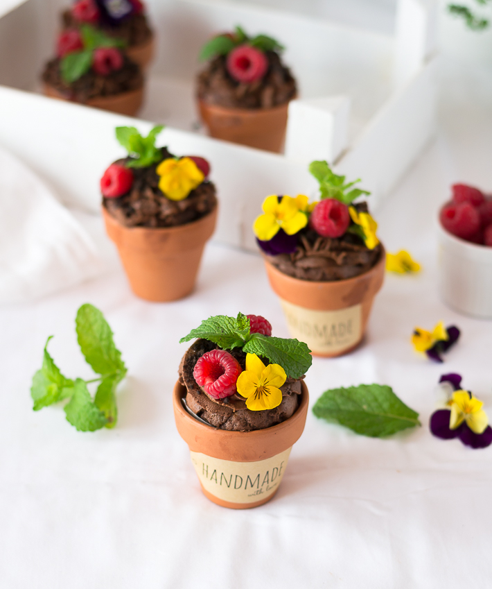 Una vez haya cogido cuerpo la ganache y las magdalenas estén frias montamos las macetas. Le ponemos la ganache, añadimos las galletas trituradas y decoramos con la menta, y las flores y frambuesas.