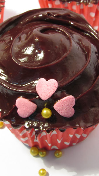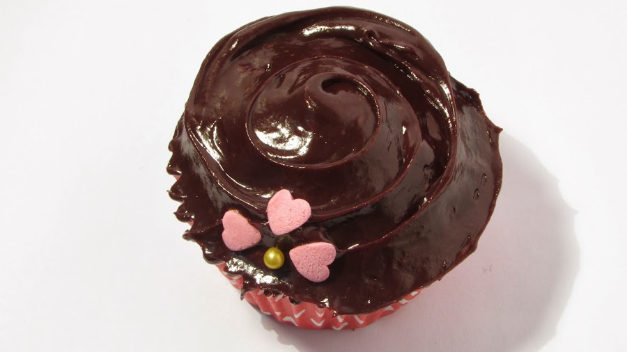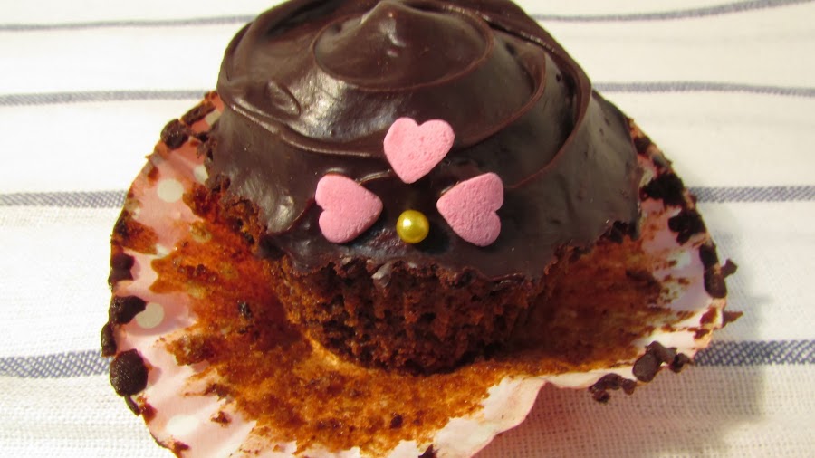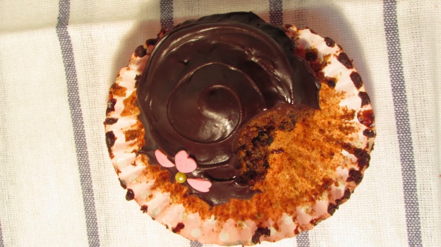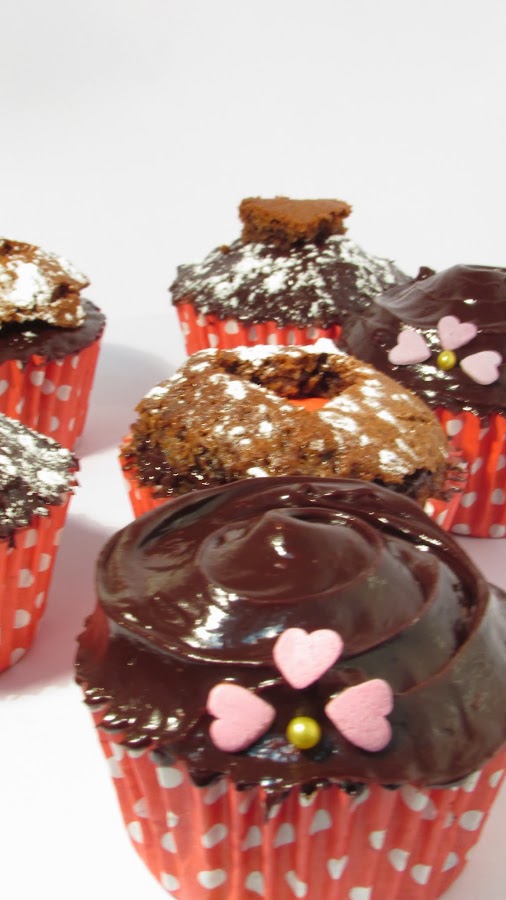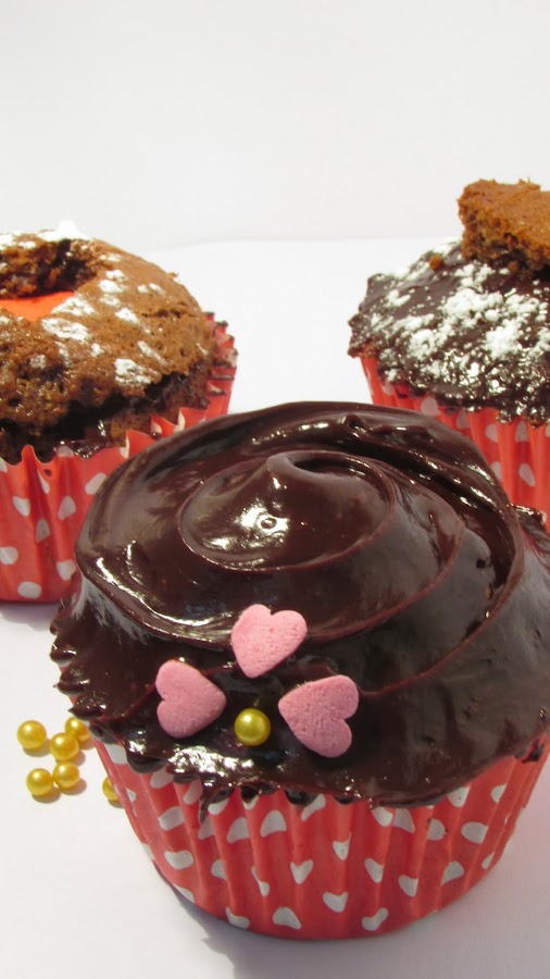 La base es de chocolate con trocitos de chocolate y la cobertura de chocolate negro fundido con un poco de nata (crema de leche). El resultado= los mejores cupcakes que he probado nunca..jeje ( cuanta modestia eh?)