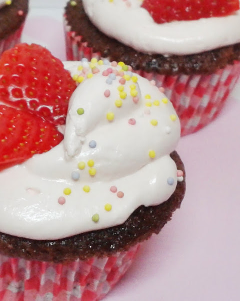 Para terminar, decoramos los cupcakes usando una manga pastelera con una boquilla redonda grande y una fresa natural.