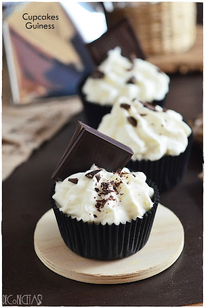 La tarta guiness es habitual en casa (receta aquí), y la última vez que la realicé me sobro cantidad de la masa de bizcocho y realicé estos cupcakes.