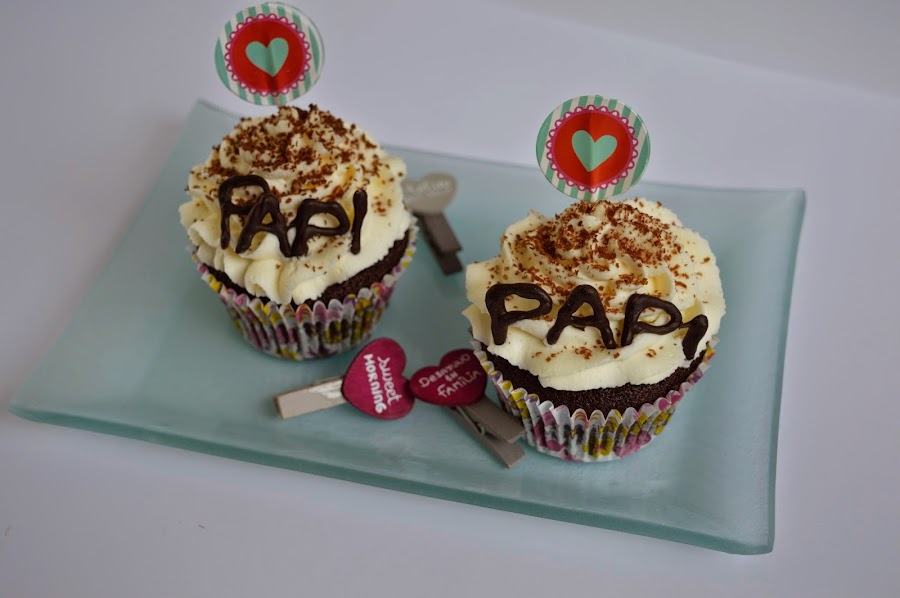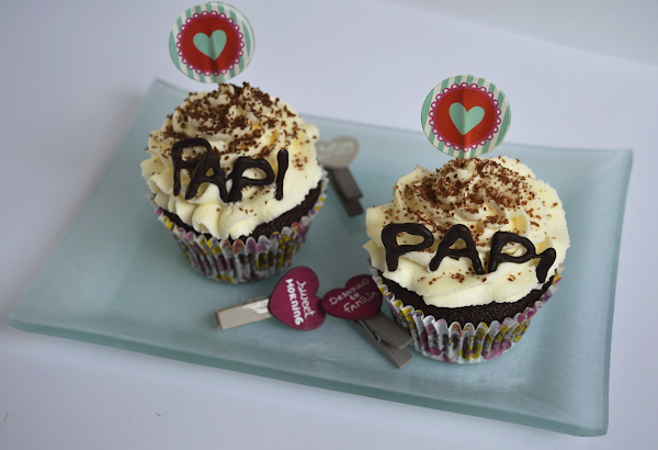 Preparé unos cupcakes guinness, decorados con un mensaje hecho con chocolate en el que ponía "PAPI",unos toppers de corazones y unas bolitas de azucar plateadas. La receta que utilice para hacerlos la saque del blog Julia y sus recetas, adapte su receta para hacerla en formato cupcakes en lugar de tarta.