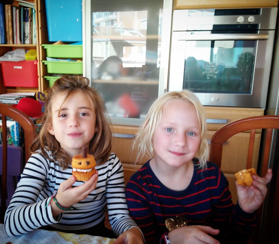Preparamos el rellenos mezclando sus ingredientes. Llevamos a una manga y vamos haciendo líneas con la boquilla estrecha de flor.Cerramos y decoramos con las chuches.