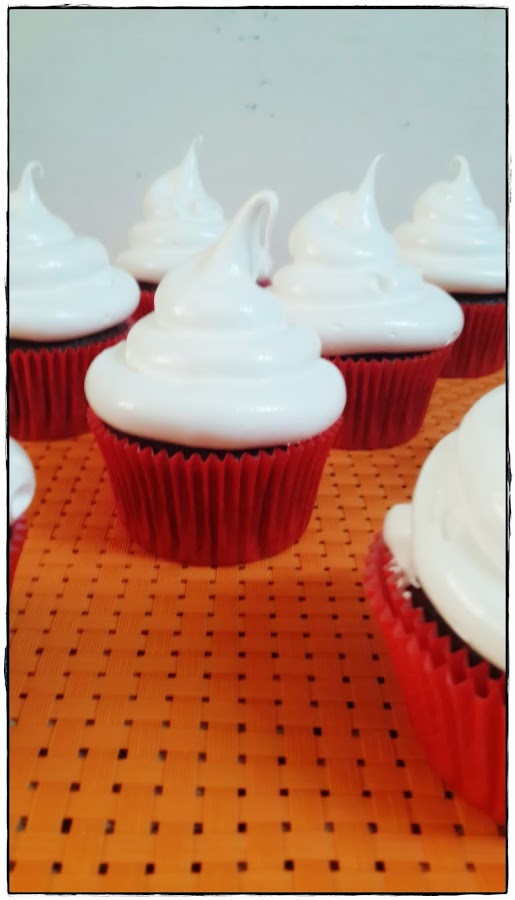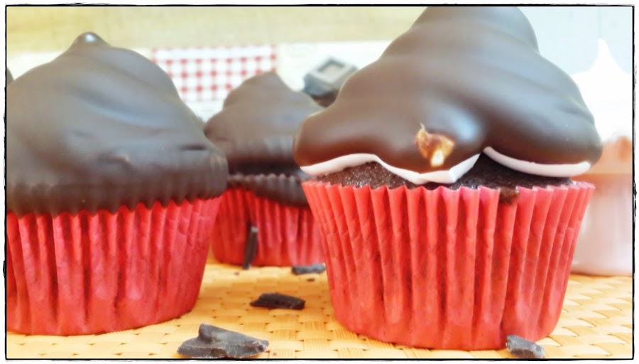 Deliciosos cupcakes de chocolate con merengue italiano y recubierto de delicioso chocolate crujiente.