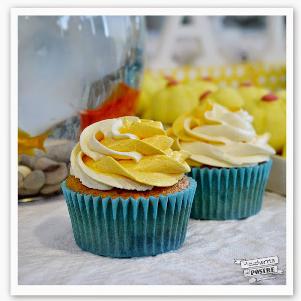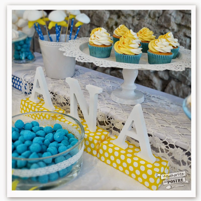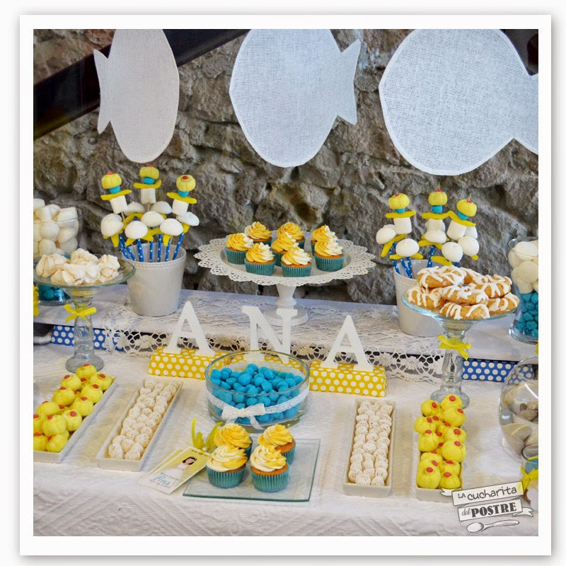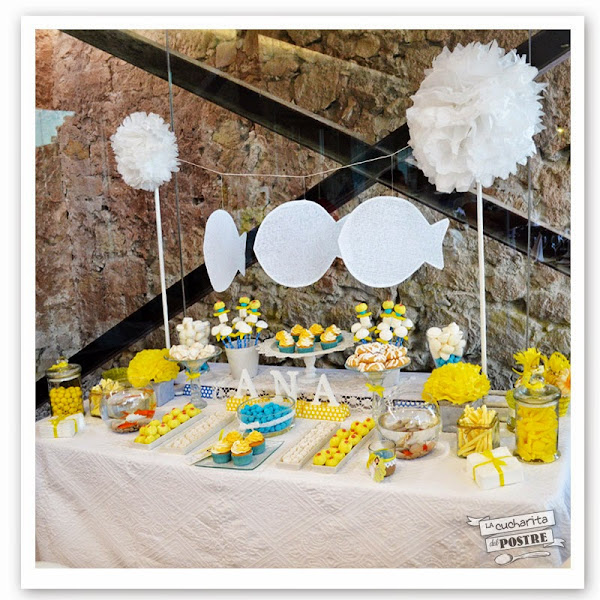 Y aquí os presentamos el resultado final de la mesa dulce: cupcakes, gominolas, sequillos, brochetas de chuches, palomitas, merengues... Un montón de dulces en tonos azul, amarillo y blanco y unas peceras con peces naranjas que dieron el toque divertido y original a la mesa.