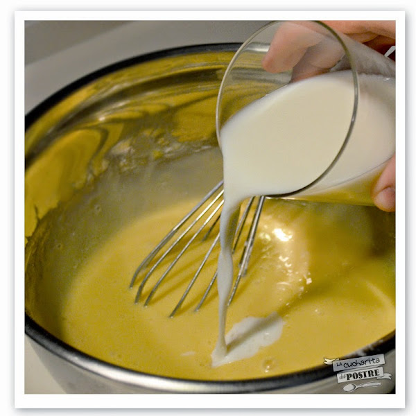 5. Vierte la mitad de la leche. Cuando esté bien integrada añade el resto de la harina tamizada y lo que queda de leche.