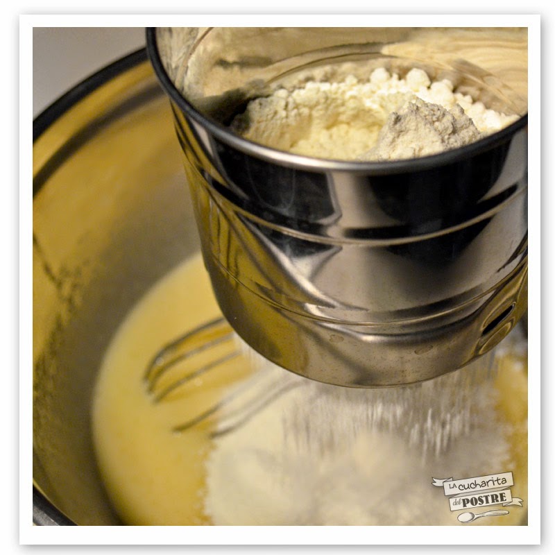 4. Mezcla la harina con la levadura o polvo de hornear y tamiza la mitad sobre la mezcla. Remueve hasta que no queden restos de harina en la masa.