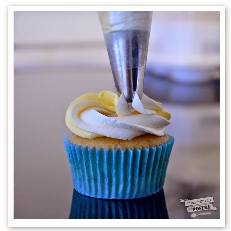 3. Para los cupcakes de almendra y limón, vamos aromatizar la buttercream que nos ha sobrado con unas gotas de esencia de limón y la vamos a dividir en dos: una parte la dejaremos blanca y, la otra, la teñiremos de color amarillo usando colorante en gel. Puedes ver esta técnica en la receta de Cupcakes bicolores de chicle. Decora haciendo copetes pequeñitos encima del cupcake usando una boquilla 2D de Wilton.