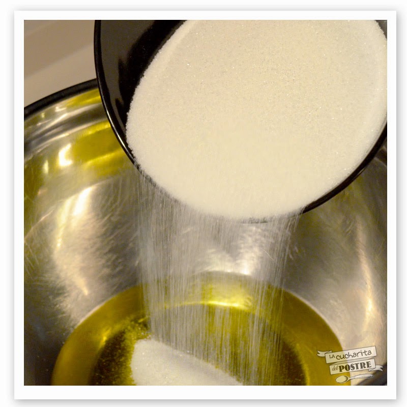 2. Mezcla el aceite con el azúcar en un bol. Podrás hacerlo con una varilla manual y sin tener que usar ningún robot de cocina.