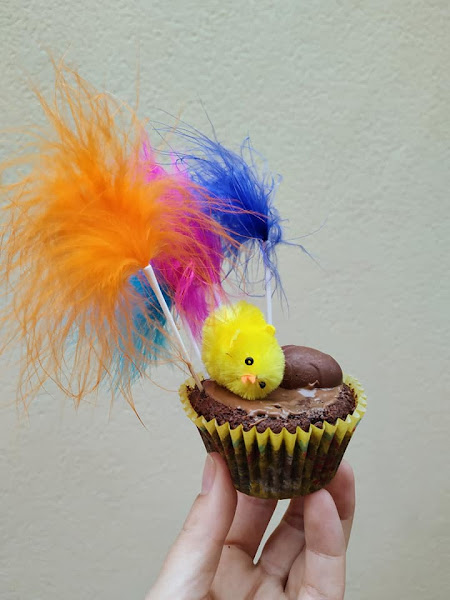 Una vez los tengamos listos, los dejamos enfriar sobre una rejilla y después decoramos, untamos crema de cacao por encima, desmoldamos los mini huevos y decoramos con plumas de colores y pollitos.
