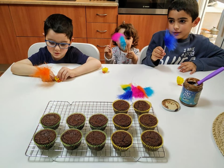 No sé quien de los tres disfrutó más decorando el suyo, con su pollito y plumitas!!! También preparamos mini huevos de chocolate aptos!!