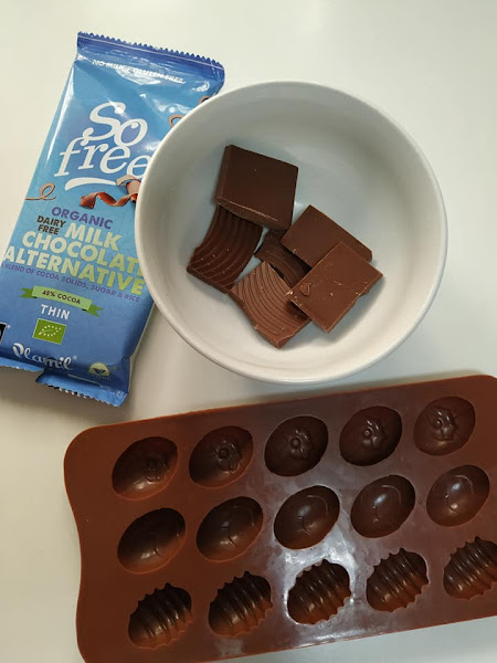 Empezamos preparando los mini huevos de chocolate, fundimos una tableta de chocolate Plamil al baño maría o en el micro (en tandas de 30seg para que no se queme) y rellenamos los moldes de silicona, metemos mientras en la nevera para que endurezca.