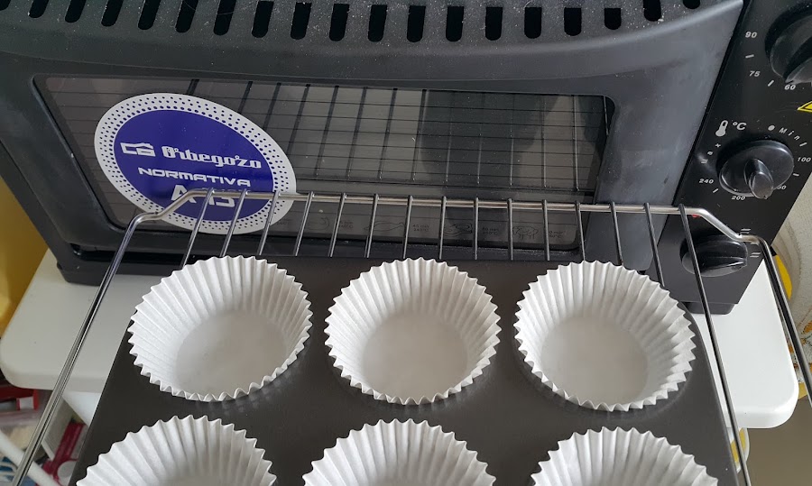 Precalentamos el horno a 180ºC. Es importante tener el horno listo para cuando hayamos terminado con la receta, ya que al no usar levadura sino bicarbonato es imprescindible hornear en seguida.