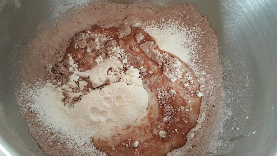 Mezclamos el vinagre junto con el bicarbonato en un vaso a parte y cuando haga burbujas lo añadimos a la masa e integramos bien.