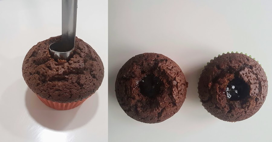 Cuando se hayan enfriado, hay que hacer un agujero a cada cupcake y rellenarlo de mermelada. Yo recomiendo usar un descorazonador de manzanas, que se puede comprar en cualquier tienda multiprecio y permite vaciar el cupcake de manera muy rápida y sencilla.