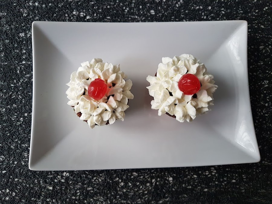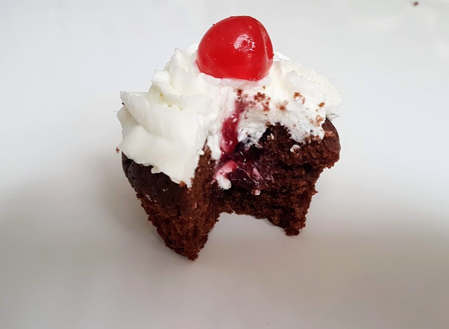 Por último sólo queda decorar con las guindas. Si es época de cerezas y puedes usarlas, mejor. Y si no eres un desastre con memoria de pez como yo, rayar el chocolate para hacer virutas y esparcirlas por encima de los cupcakes