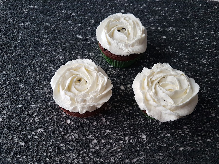 Y ahora viene la parte divertida, decorar los cupcakes. Para estos yo utilicé la clásica boquilla 2D de Wilton, pero cualquier boquilla de estrella sirve. Uno de los motivos por los que elegí los cupcakes en vez de la tarta es porque hacía siglos que no hacía cupcakes y la verdad es que me vine arriba con la manga pastelera. Para las fotos hice la típica decoración en la que se empieza por el borde del cupcake y se va haciendo una espiral hasta llegar al centro. Pero también hice alguna rosa y unas hortensias.