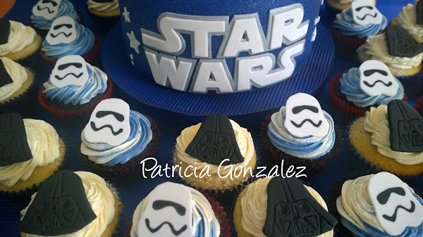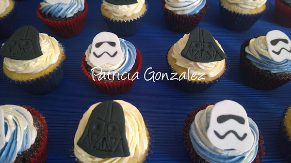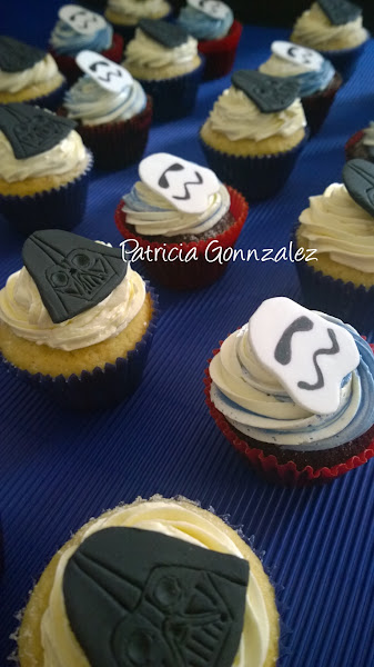 Cupcakes de Stars Wars, las figuras están hechas con pasta para modelar pintados con colorante vegetal comestible, frosting de crema de manteca, los cakes de vainilla (masa Básica) Ingredientes: harina 0000 - 320 gr., Azúcar 250 grs., Polvo para hornear 12 grs., Aceite de girasol 60 grs., manteca 60gr., huevo 110grs., leche180 grs., Preparacion: tamizar la harina, polvo de hornear y azúcar. Batir ligeramente y el resto de los ingredientes y combinar ambas preparaciones. La masa debe quedar ligeramente grumosa. agregar los sabores que se deseen. Llenar unos 12 moldes de muffins hasta 2/3. hornear a 180°C por 20 minutos. dejar entibiar levemente y voltear sobre un papel manteca para obtener una superficie plana par agregar el frosting. dejar enfriar por completo....para los de chocolates te dejo mi receta de los Cupacakes de super heroes: