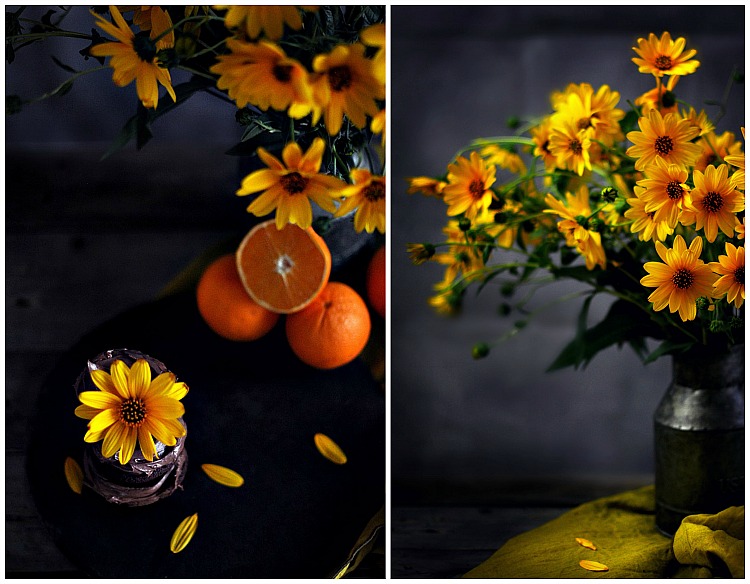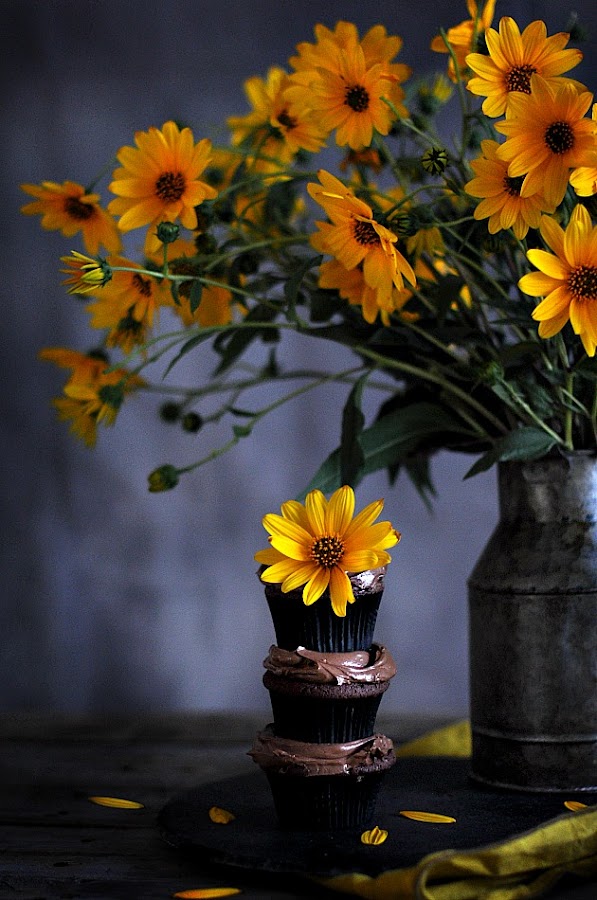 Tocan a la puerta y es mi vecina alemana que me trae de vuelta una bandeja donde, unas semanas atrás le lleve un bizcocho. Ahora me lo devuelve con un hermoso ramo de margaritas amarillas silvestres que se dan en su jardín. Desde que las vi tuve la imagen de ellas acompañadas con deliciosos cupcakes de chocolate. Así fue como me puse manos a la obra para despuès gozar de poder tirar fotos tan hermosas como estas. Cupcakes de chocolate con ligero sabor a naranja y glaseado de chocolate negro.