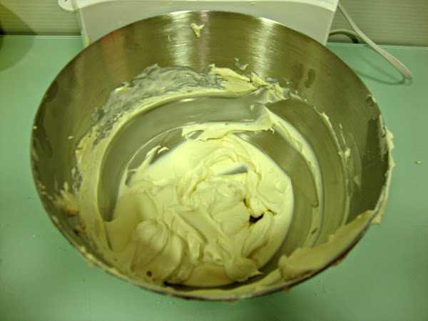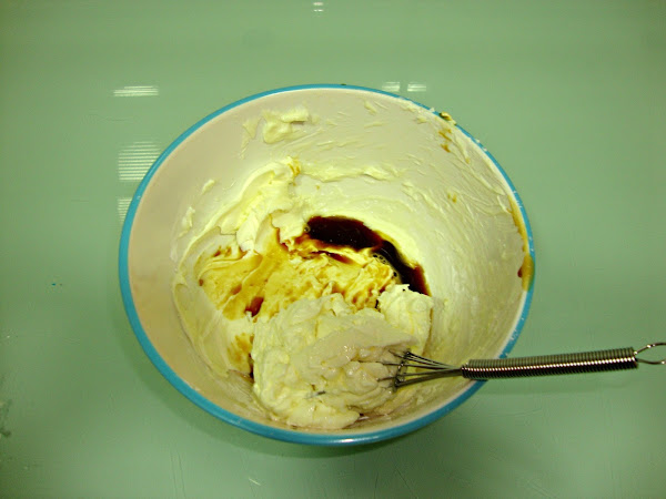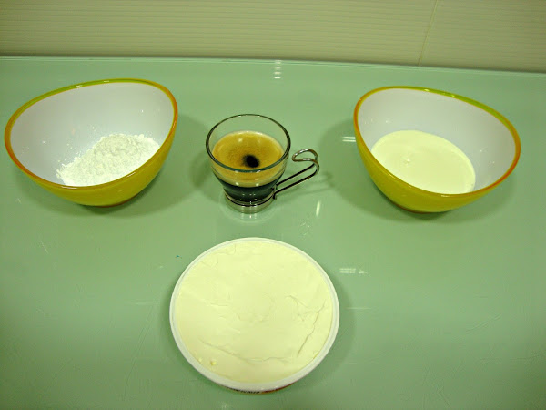Batimos el mascarpone con el azúcar glass y el café. Montamos la nata (crema de leche) y le añadimos la mezcla del mascarpone.