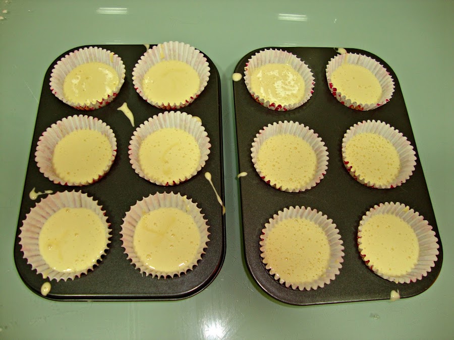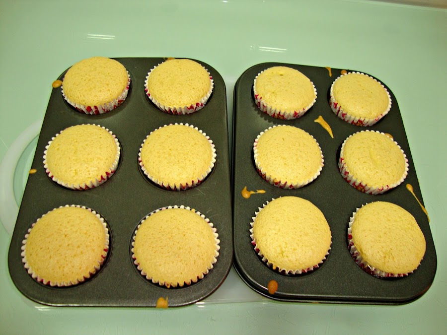 Repartimos en las cápsulas de cupcakes y horneamos en horno caliente a 175ºC durante 20 minutos, luego sacamos y ponemos a enfriar en una rejilla.