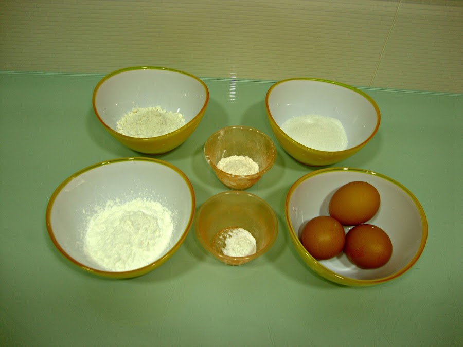 Tamizamos ambas harinas, el preparado de natillas y la levadura. Separamos la yema de la clara de los huevos.