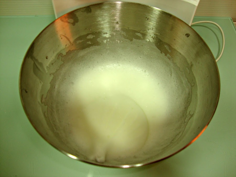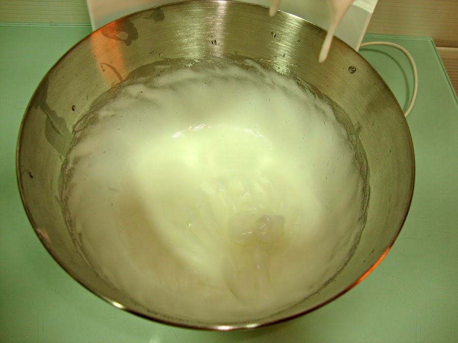Batimos las claras con la sal hasta que estén a punto de nieve y luego espolvoreamos lentamente el azúcar para que brille.