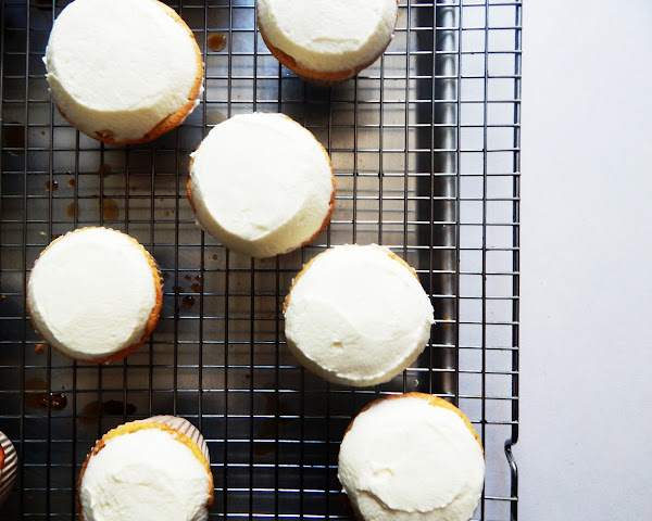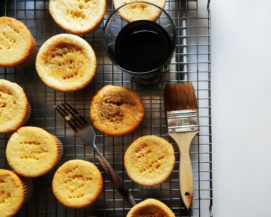 Picamos cada cupcake unas cuantas veces con un palillo o tenedor. Con la ayuda de una brocha mojamos cada cupcake con el jarabe de café y vino marsala hasta terminar con todo el jarabe.