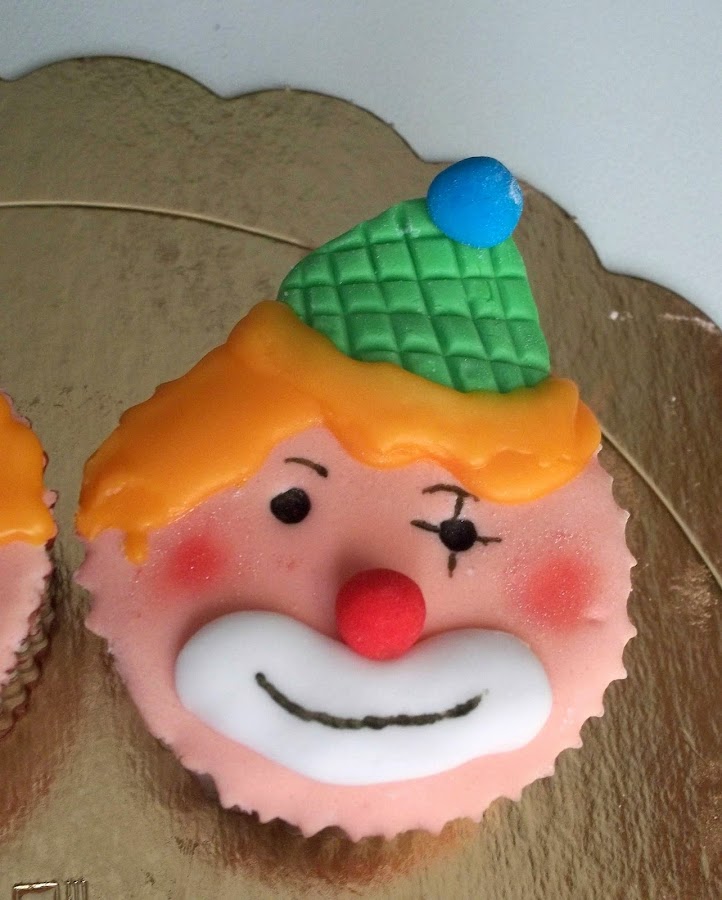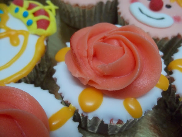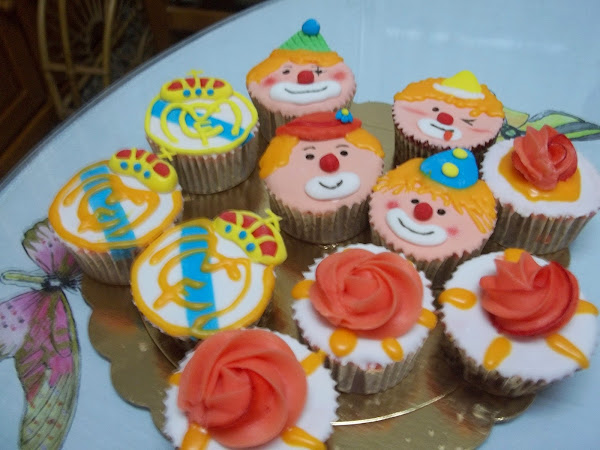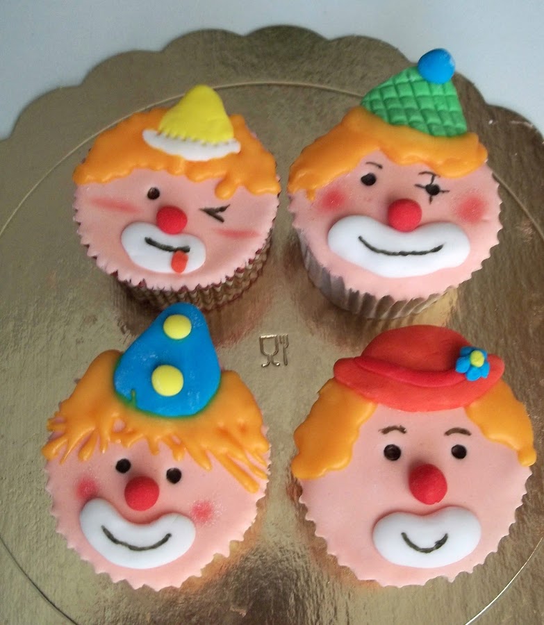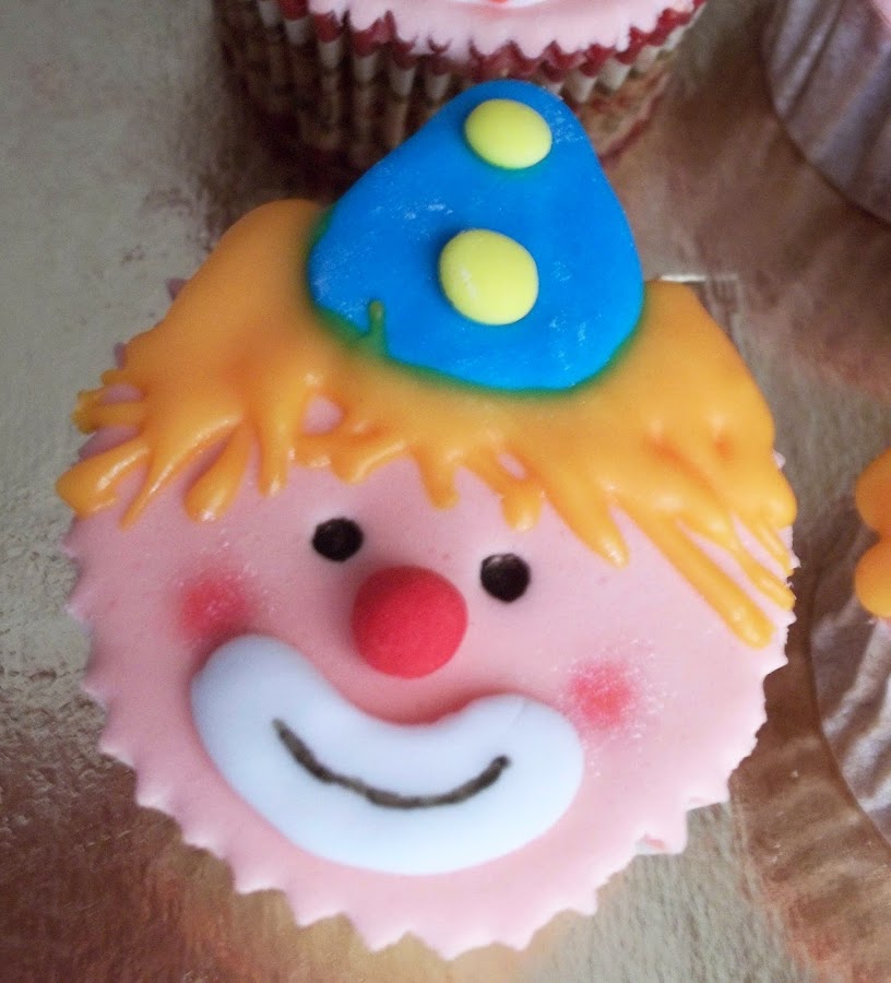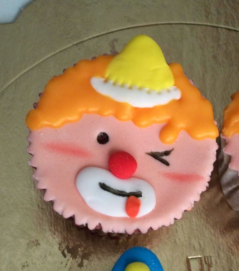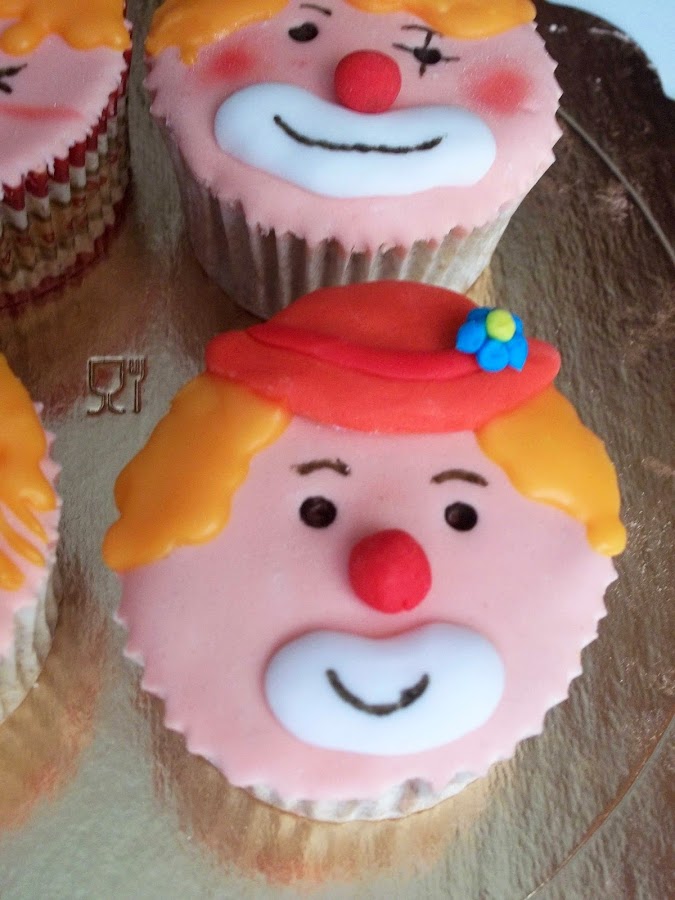 Estos cupcakes los hice porque quería probar la esencia de sabor cherry que me acababa de comprar. Los payasetes están hechos con fondant excepto el pelo que lo hice con glasa con sabor a cherry. Me quedaron muy cuquis XD.